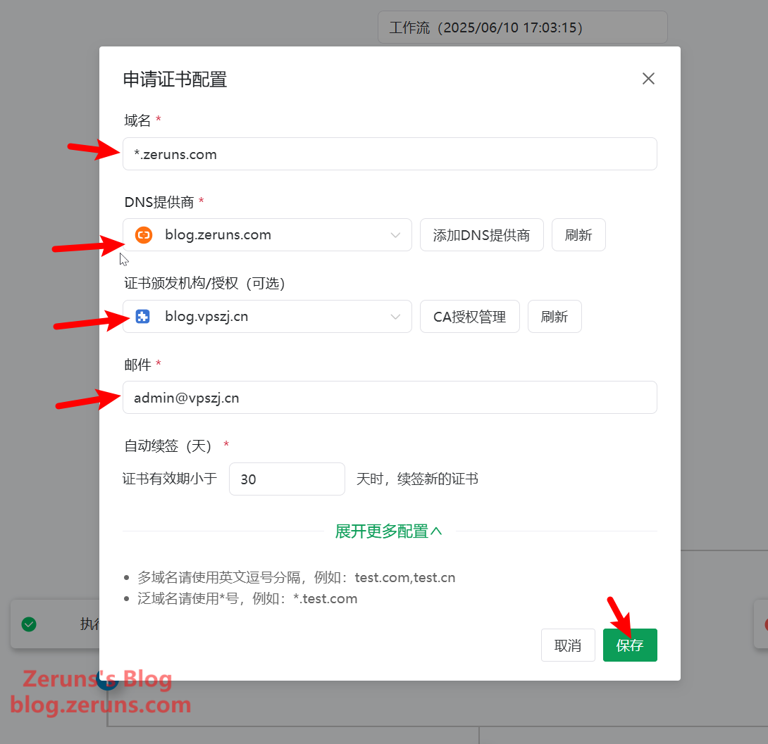 Click the "Not Configured" section under Request Certificate to set up your certificate request. Enter your domain name, and since I’m using ZeroSSL with wildcard support, I input *.zeruns.com. Choose your DNS provider, select the CA authorization you added earlier, and input your email. Leave other settings as default and click Save.