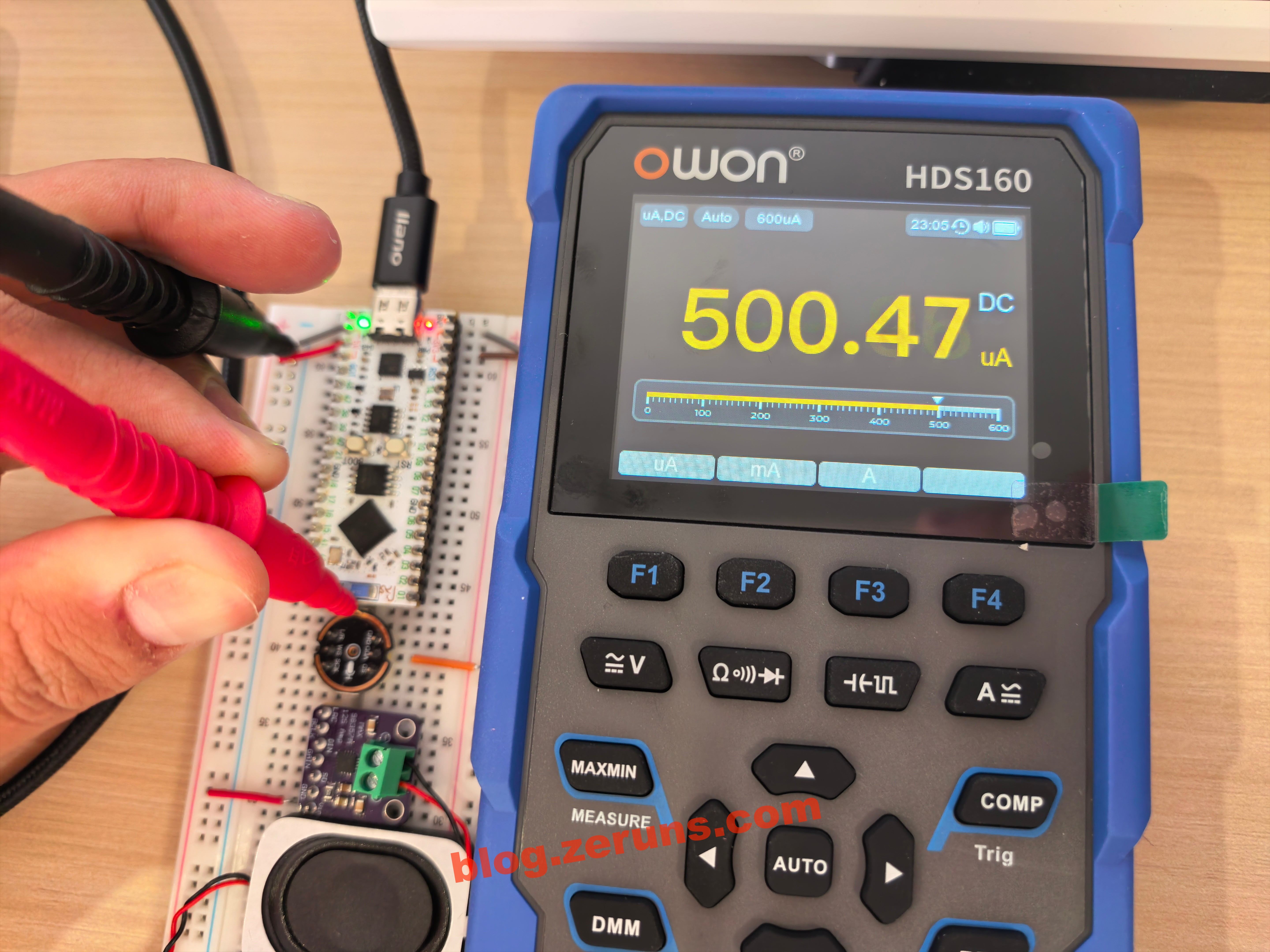 Measuring the operating current of an INMP441 digital microphone (powered but not communicating). The images below show the multimeter mode and oscilloscope mode respectively, with an RMS current of around 500 μA.