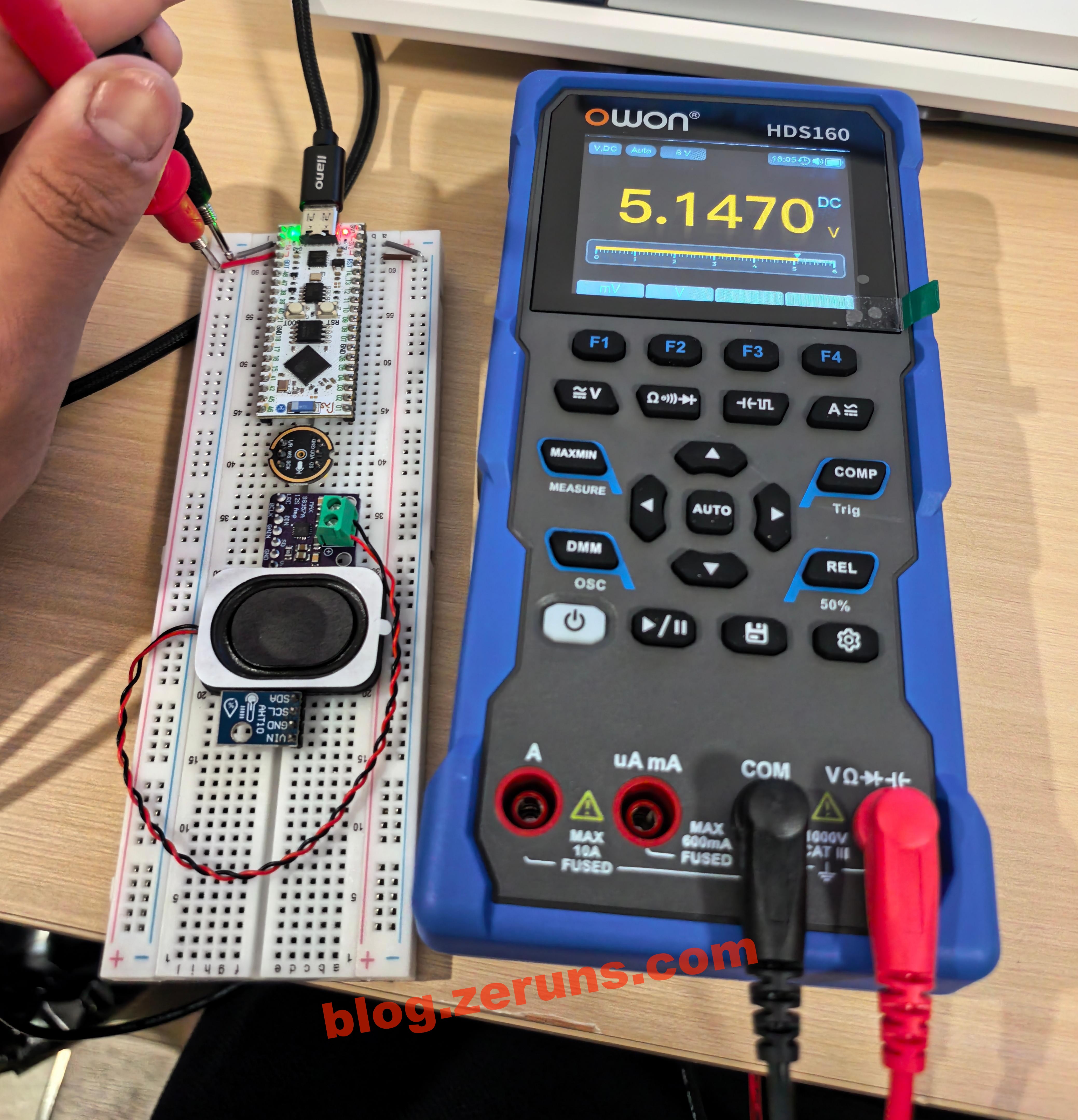 In oscilloscope mode, measuring the audio output waveform of a MAX98357A. It appears to be PDM‑modulated.