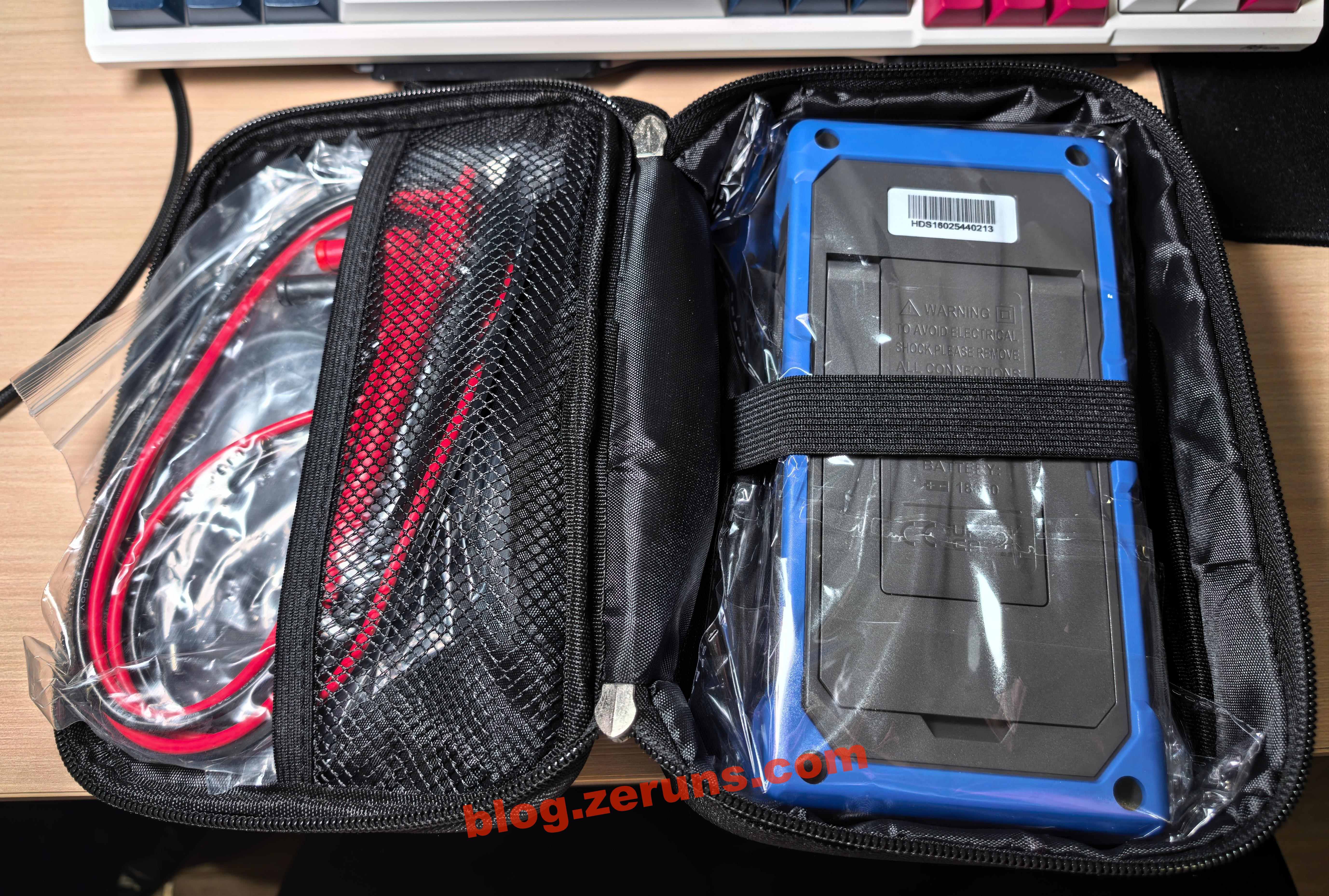Opening the carrying case, you'll find the multimeter itself, a pair of standard test leads (not ultra‑sharp probes), and a USB Type‑C cable.