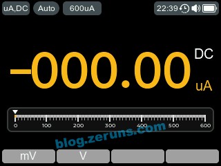 Long‑press the power button to turn it on. By default, it powers up in DC voltage mode of the multimeter, using a dark theme. Press F1 to switch to the millivolt range. The probe jacks at the bottom are blocked here because the charging port cover has been slid down.