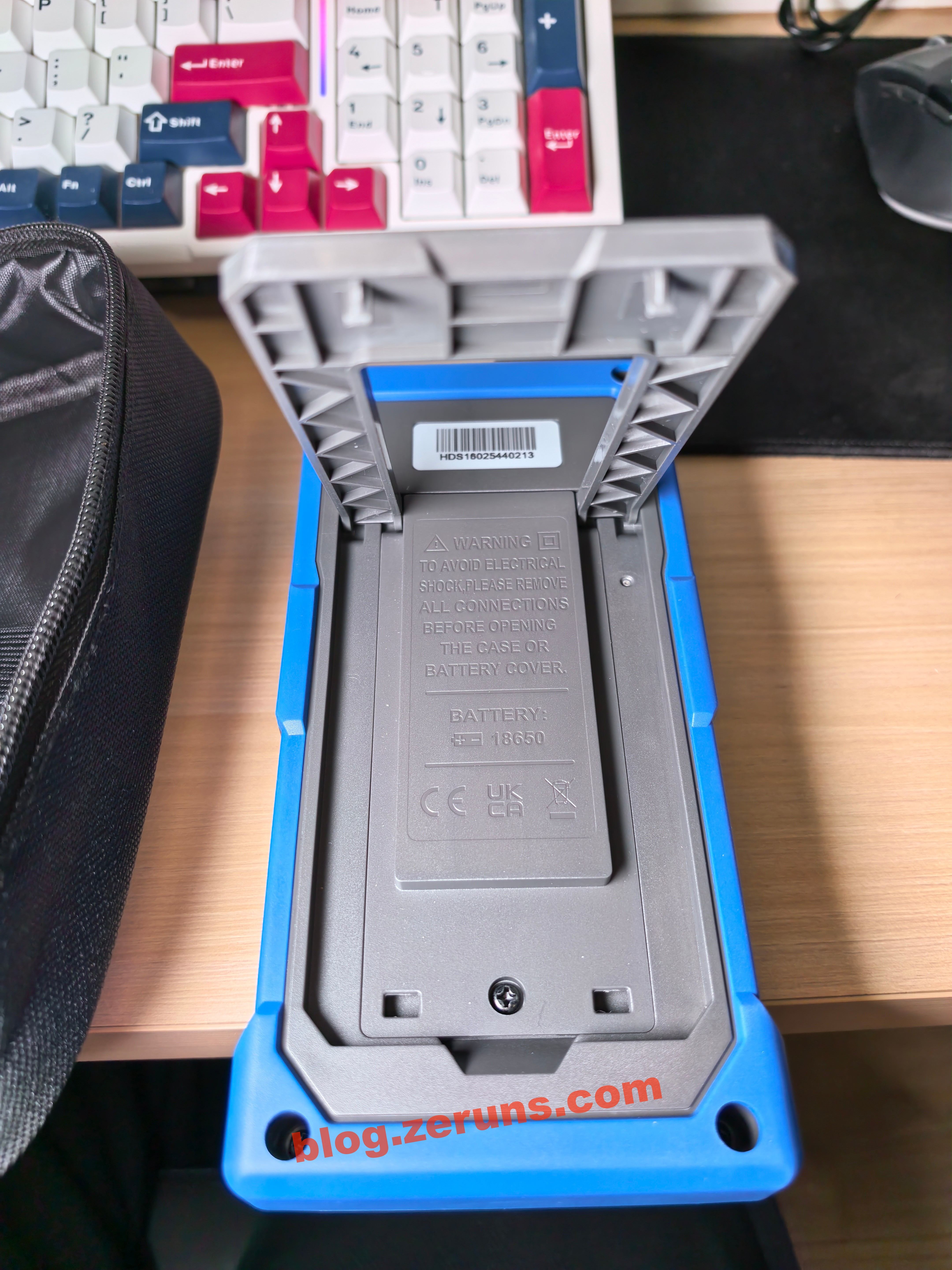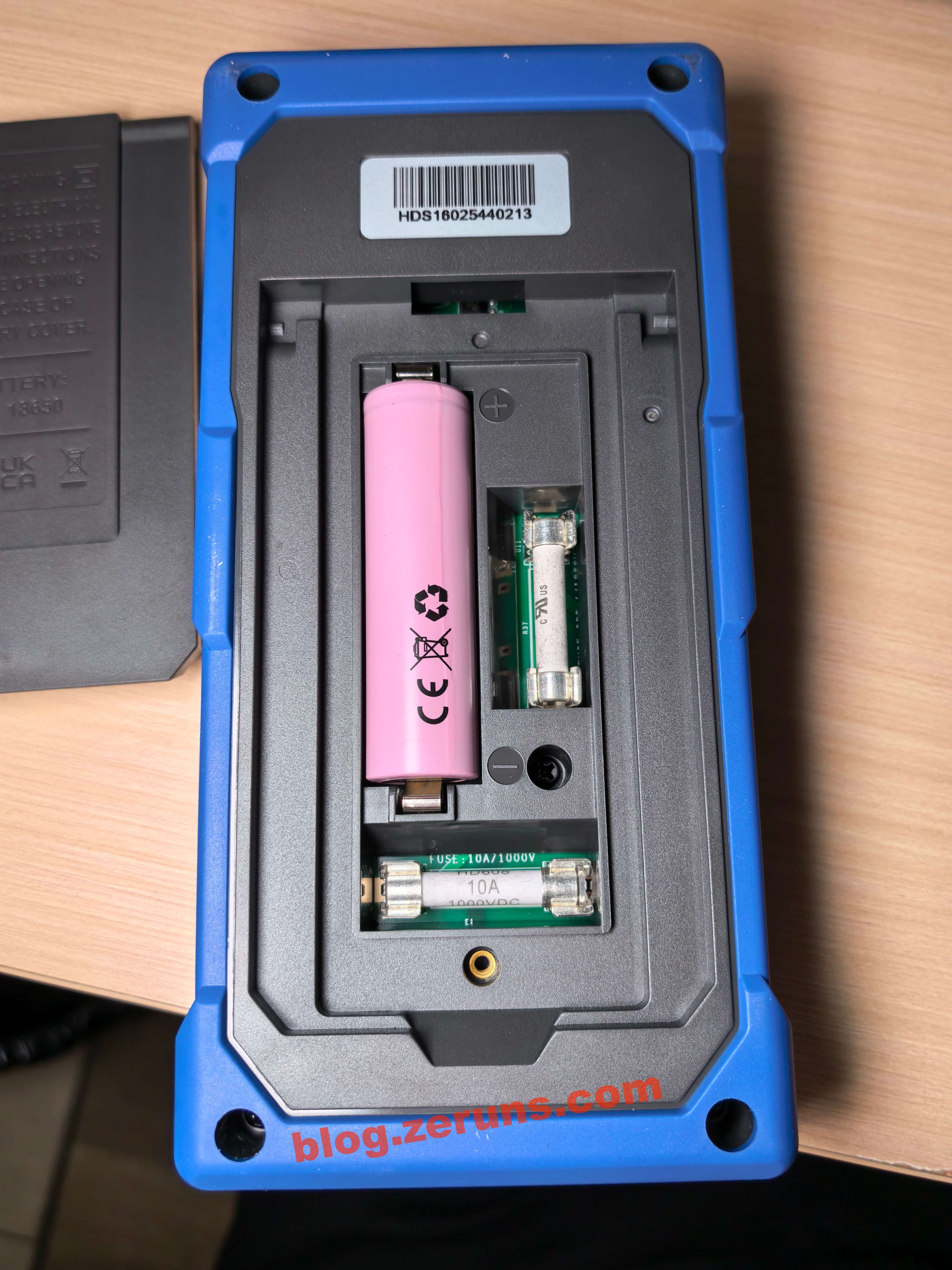 Remove the screw on the rear kickstand to take it off, and you'll see the 18650 battery and two fuses. The fuse under the battery is rated at 10 A, while the one next to the battery is rated at 600 mA, likely for the milliamp current range.