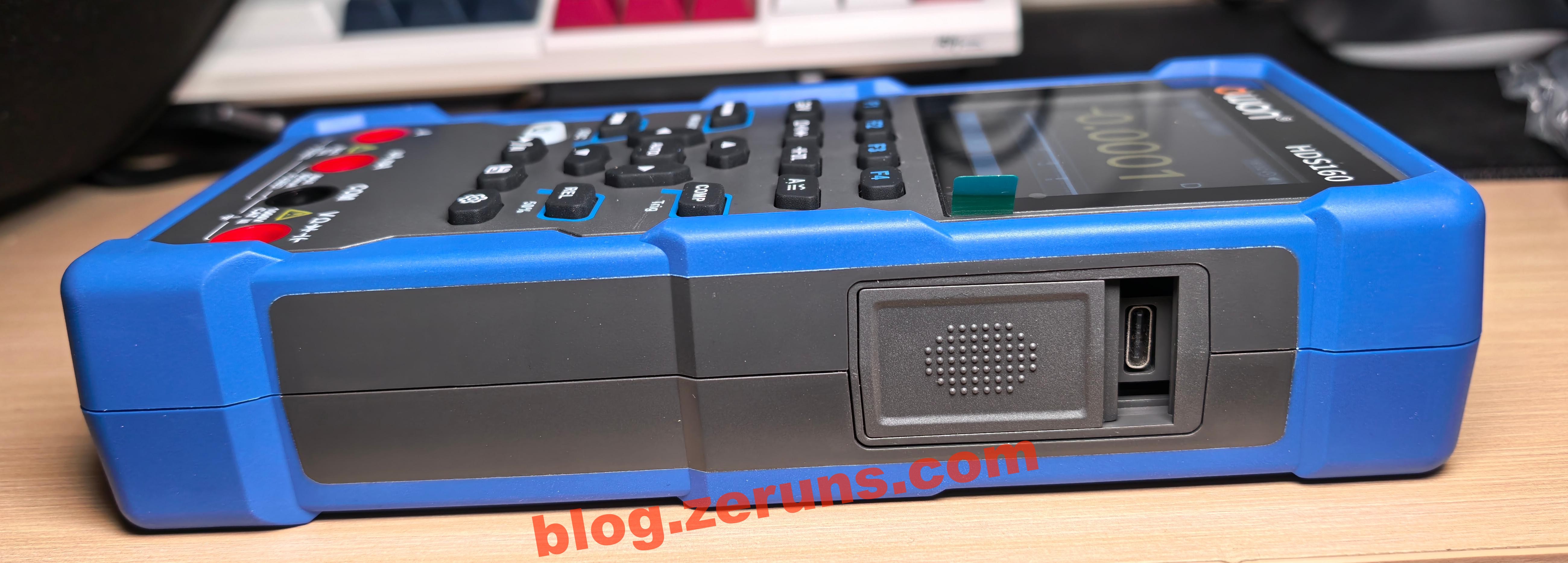 On the side of the multimeter, there's a USB Type‑C port for charging. When connected to a PC, it shows up as a virtual USB flash drive, allowing you to directly copy oscilloscope screenshots. The Type‑C port looks slightly crooked (you'll see why in the teardown—it seems to be misaligned during soldering). There's also a small sliding cover here: when it's slid down for charging, it blocks the probe input jacks, preventing the meter from being used while charging.