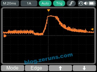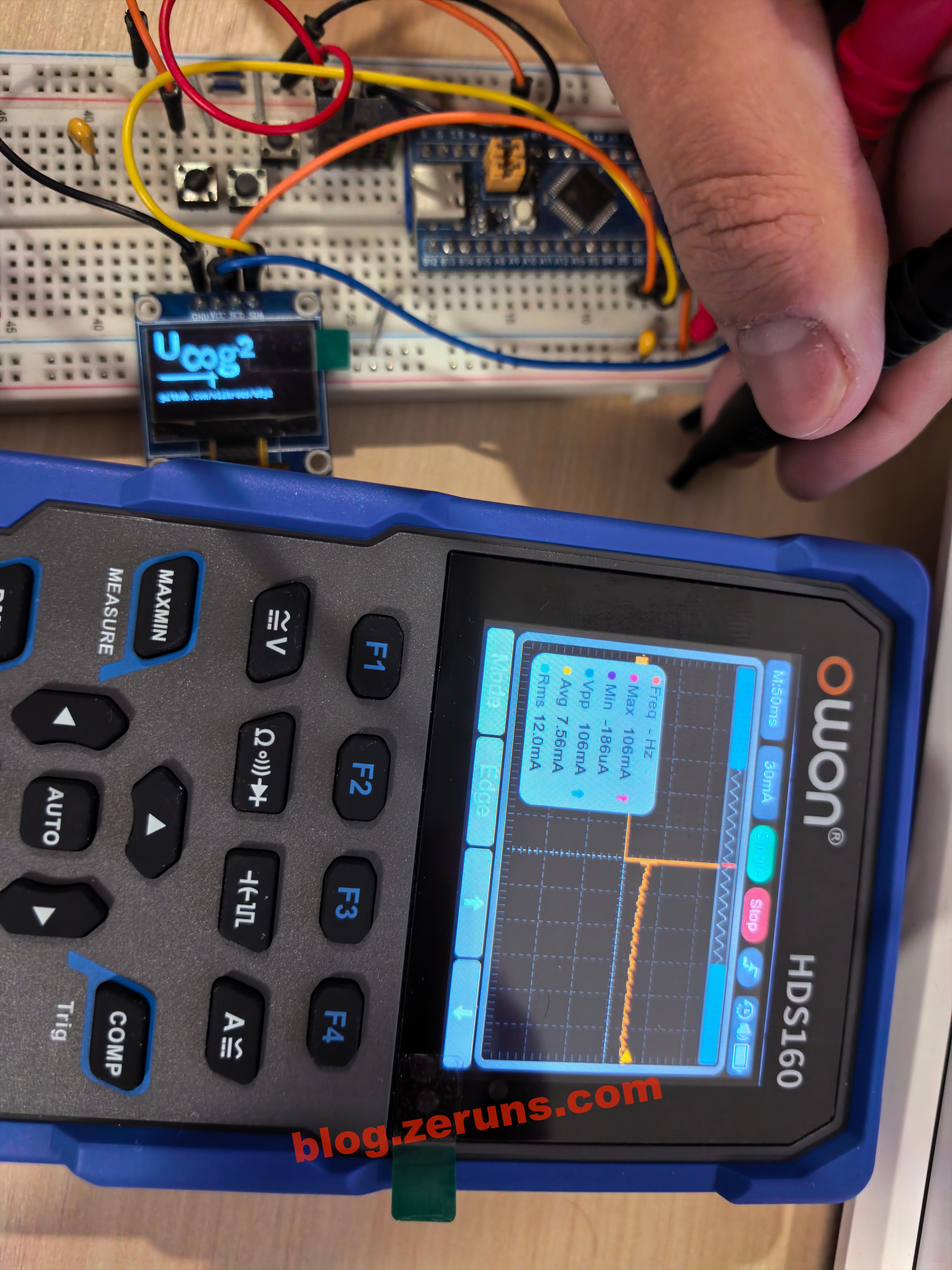 Insert the probes into the current input jack, and the meter automatically switches to the current range. In oscilloscope mode, you can switch to single‑shot trigger and capture the inrush current waveform when powering up an STM32F103 microcontroller board with an OLED display. The peak current measured is 106 mA.