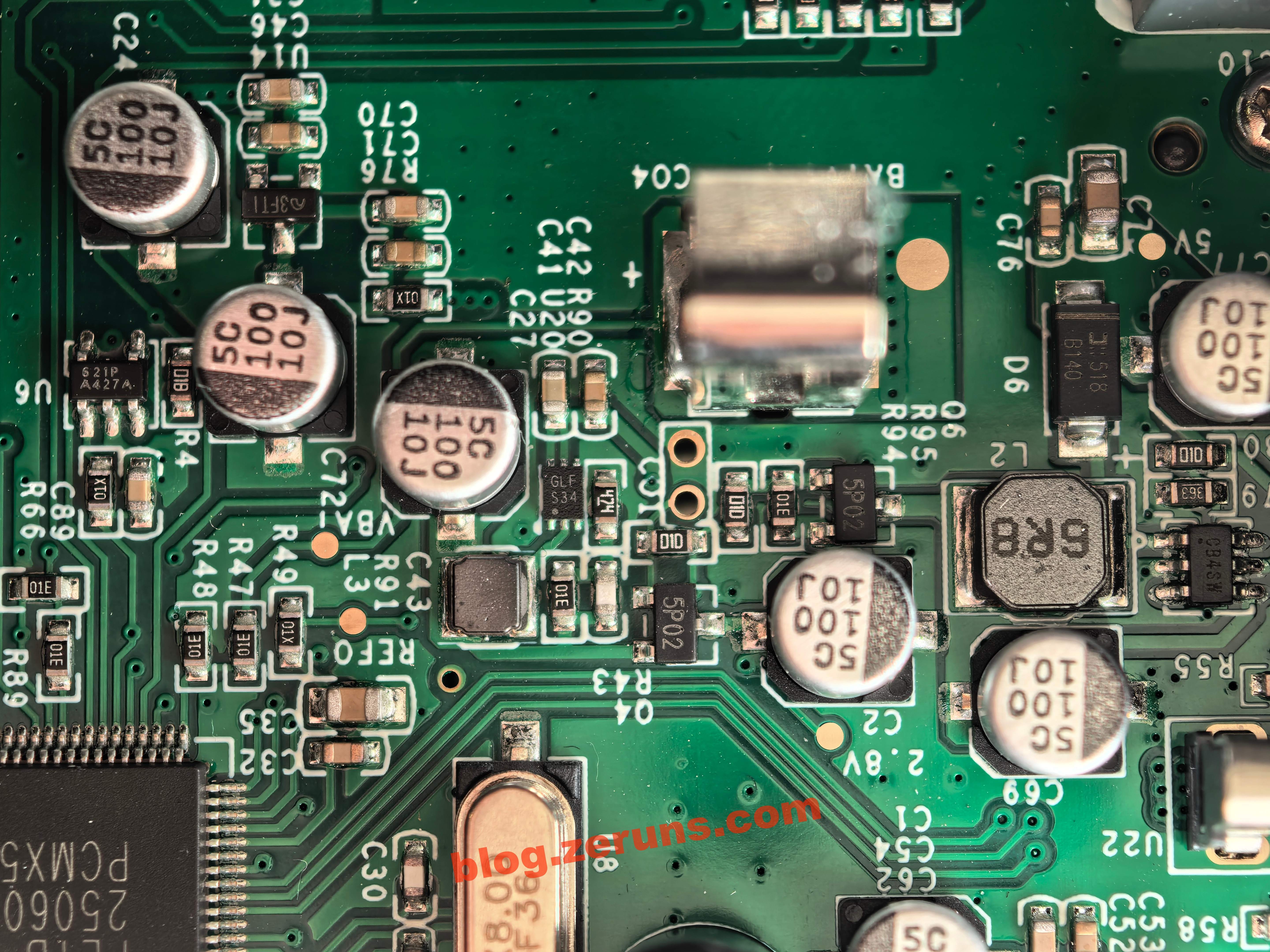 There are several small ICs, a bunch of electrolytic capacitors, and two inductors in this area. This section appears to be the DC‑DC power supply, providing various voltages to different parts of the circuit. The IC markings include S21P‑A427A, 3FT1, GLF‑S34, 5P02, and CB4SW.